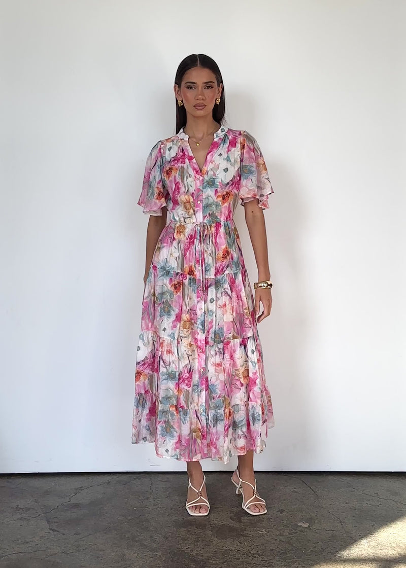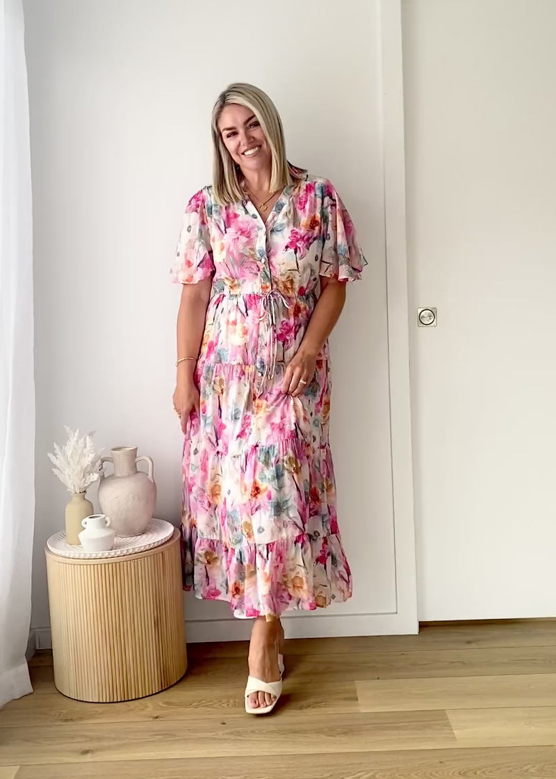 Chic and playful, the Siana Midi Dress in Pink Blooms brings a feminine twist to your summer wardrobe. Team with block heels and a cute mini bag for brunch dates or parties.