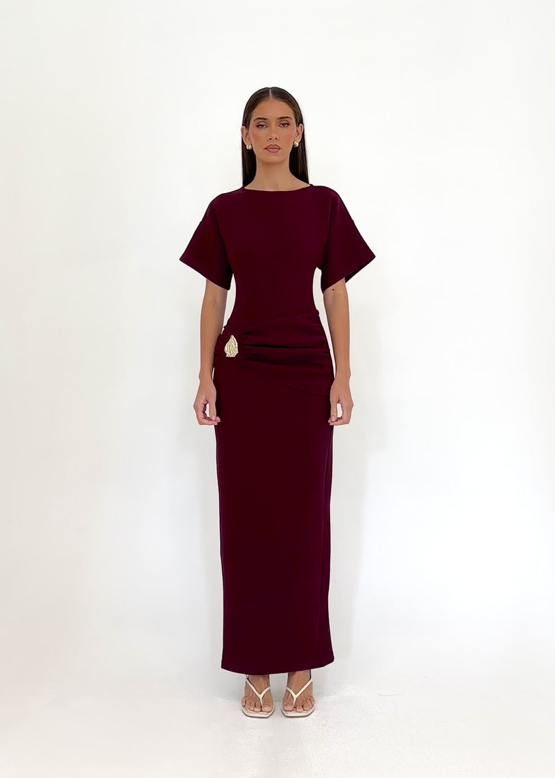 Rich plum tones create a striking yet elegant look. Style with strappy heels and statement jewellery for special occasions. Tallie Maxi Dress offers graceful movement with a bold finish.