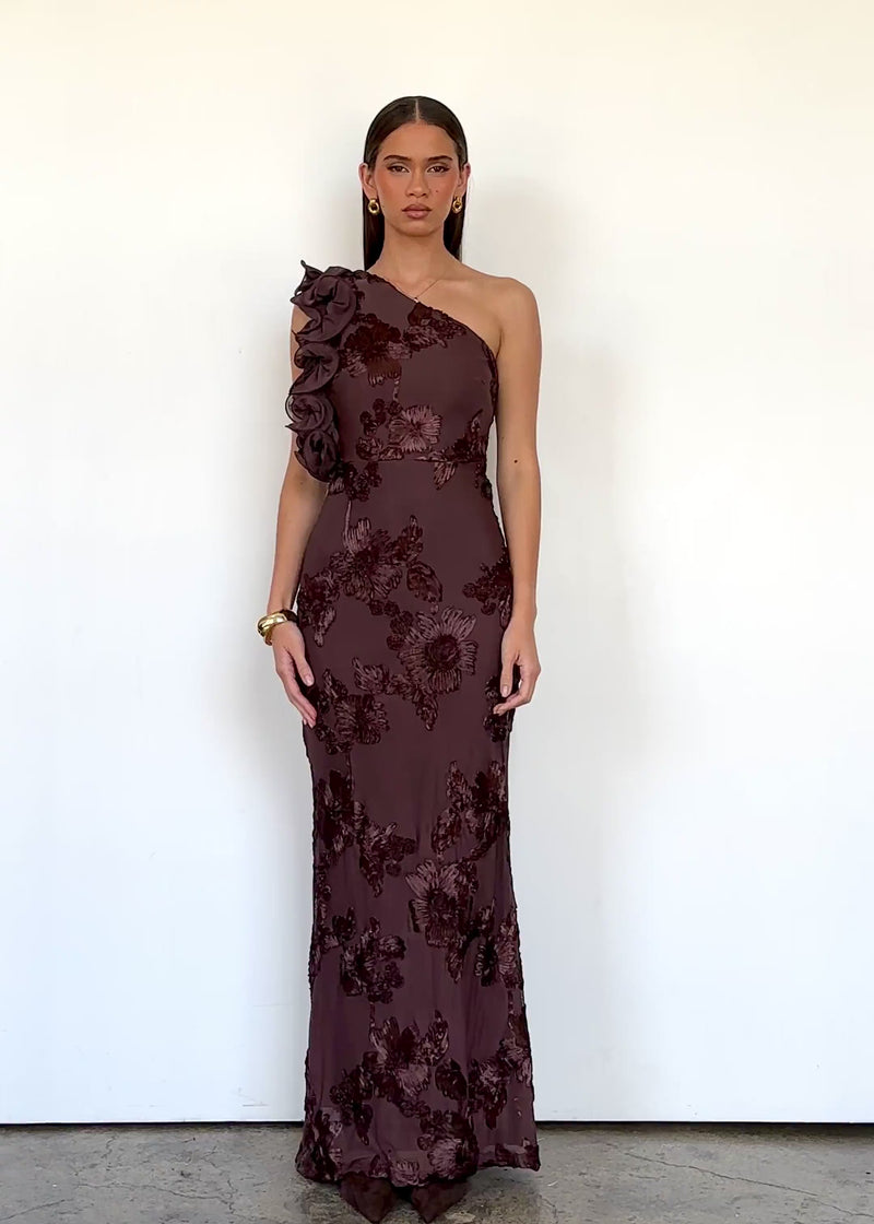 Step out in confidence with the Taysia One Shoulder Mesh Maxi Dress in Chocolate. This statement piece features a flattering one-shoulder cut and a beautifully textured finish, ideal for evening events or formal dinners. Match it with statement earrings, high heels, and a sleek clutch for a refined yet bold look.