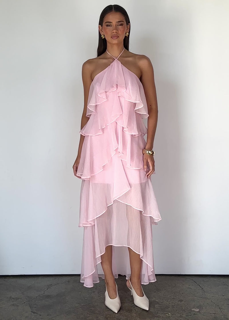 Channel soft sophistication in the Telaena Halter Maxi Dress in Blush. Its halter neckline and flowing silhouette make it perfect for garden weddings or date nights. Style with gold heels and dainty accessories.