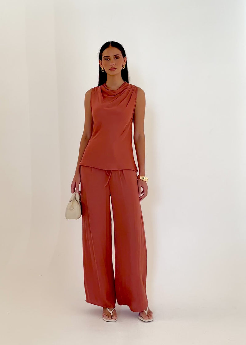 Relaxed yet elevated, the Tiah Pants – Terracotta suit brunch dates, errands, or warm getaway outfits. Style with a fitted cami or complete the look with the matching Tiah Top for a sleek head-to-toe moment. Add to cart and enjoy effortless set dressing.