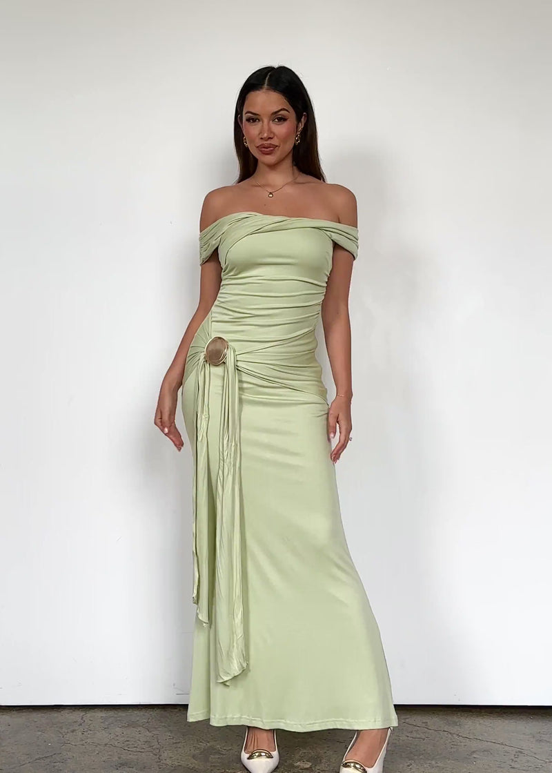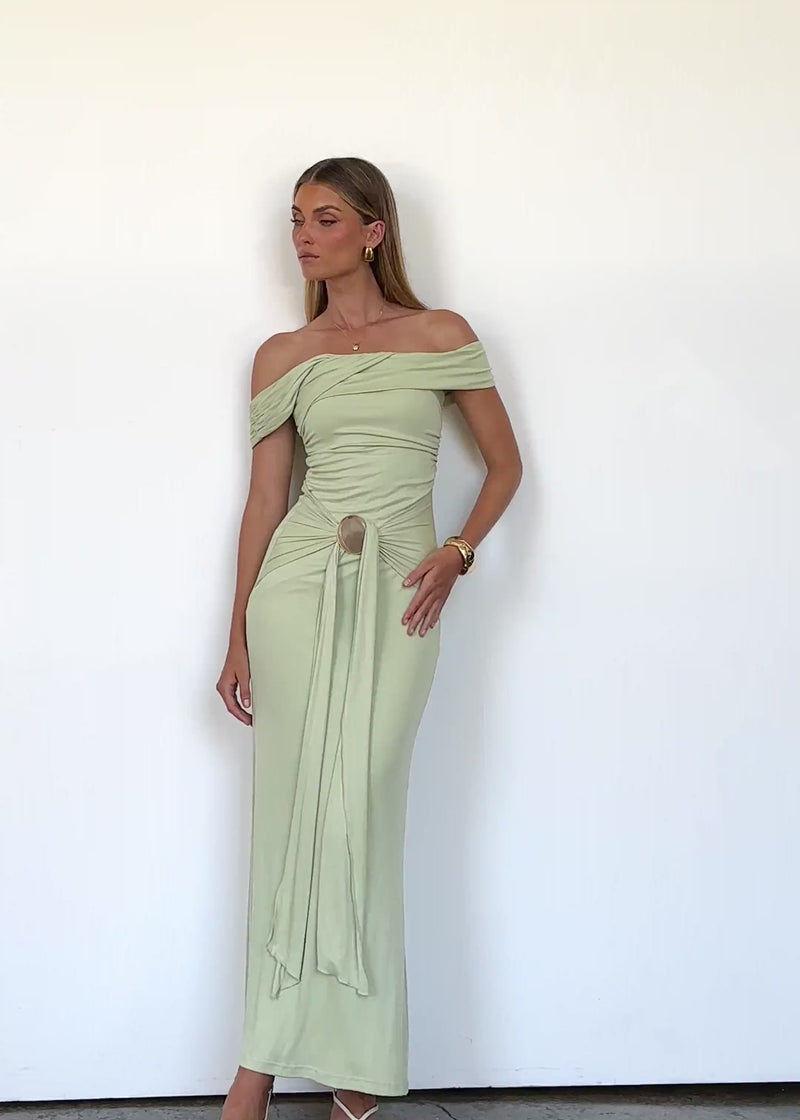 Fresh and eye-catching, the Tiarna Off Shoulder Maxi Dress in Matcha excudes modern charm. Style with wedges and a straw bag for brunch, or heel it up with gold jewellery for night plans.