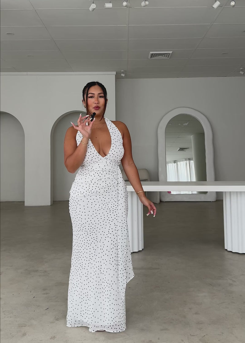 Playful yet chic, the Tori Halter Maxi Dress turns heads with its flirty polka dots and breezy silhouette. Pair it with strappy sandals and statement hoops for that effortlessly cool summer look.