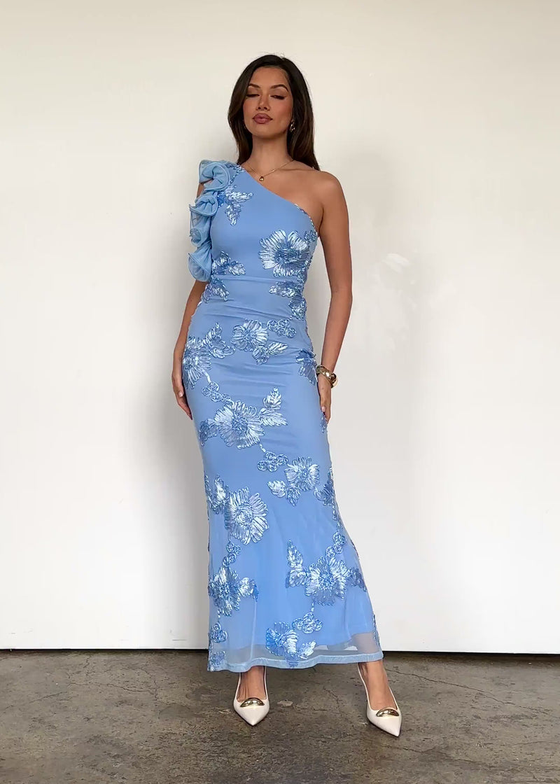 A one-shoulder silhouette and mesh details make the Trilby Maxi Dress in Blue Floral a showstopper. Wear it with straight, sleek hair tucked behind one ear and a dainty hairpin. Finish with nude heeled sandals, a satin clutch, and silver teardrop earrings for a sophisticated evening look.