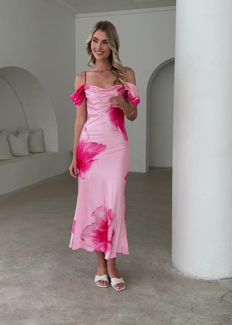 Introduce a charming addition to your collection with the Vanetia Maxi Dress, featuring a delightful pink floral print. For a refined daytime outing, pair it with comfortable wedge heels and a structured clutch. For an evening look, opt for elegant heeled mules and subtle accessories for a polished finish.