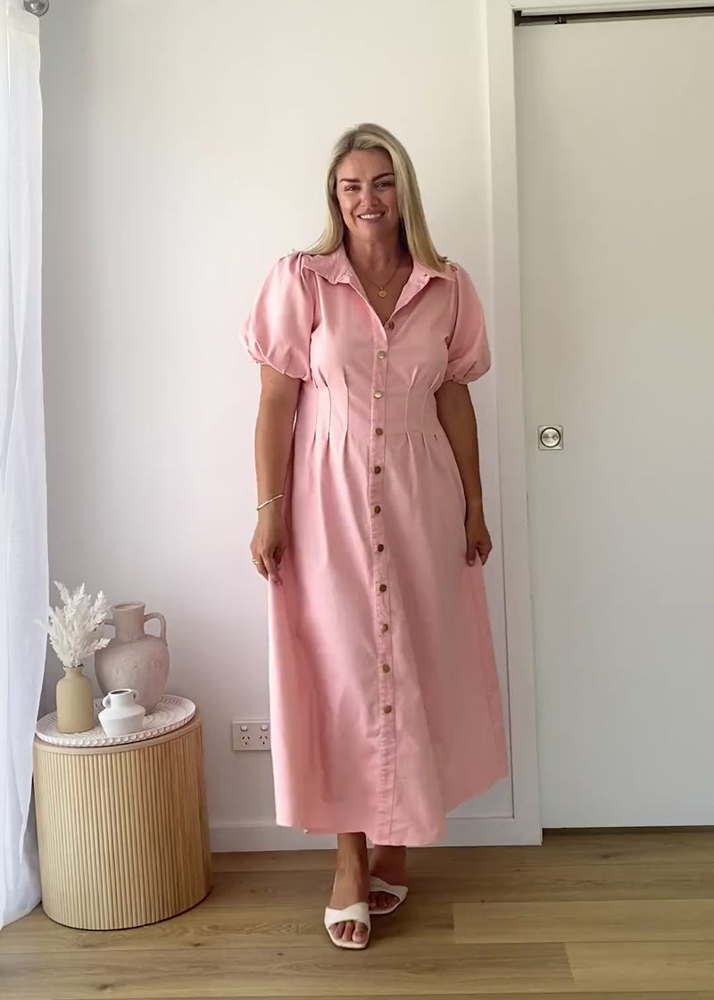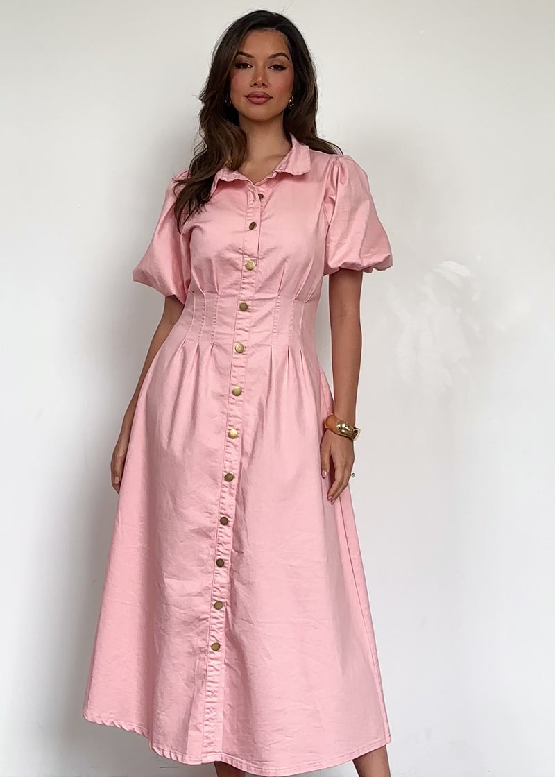 Chic and structured, the Yves Stretch Denim Midi Dress in Pink gives off cool-girl confidence. Pair with white sneakers for day or heeled boots for night.