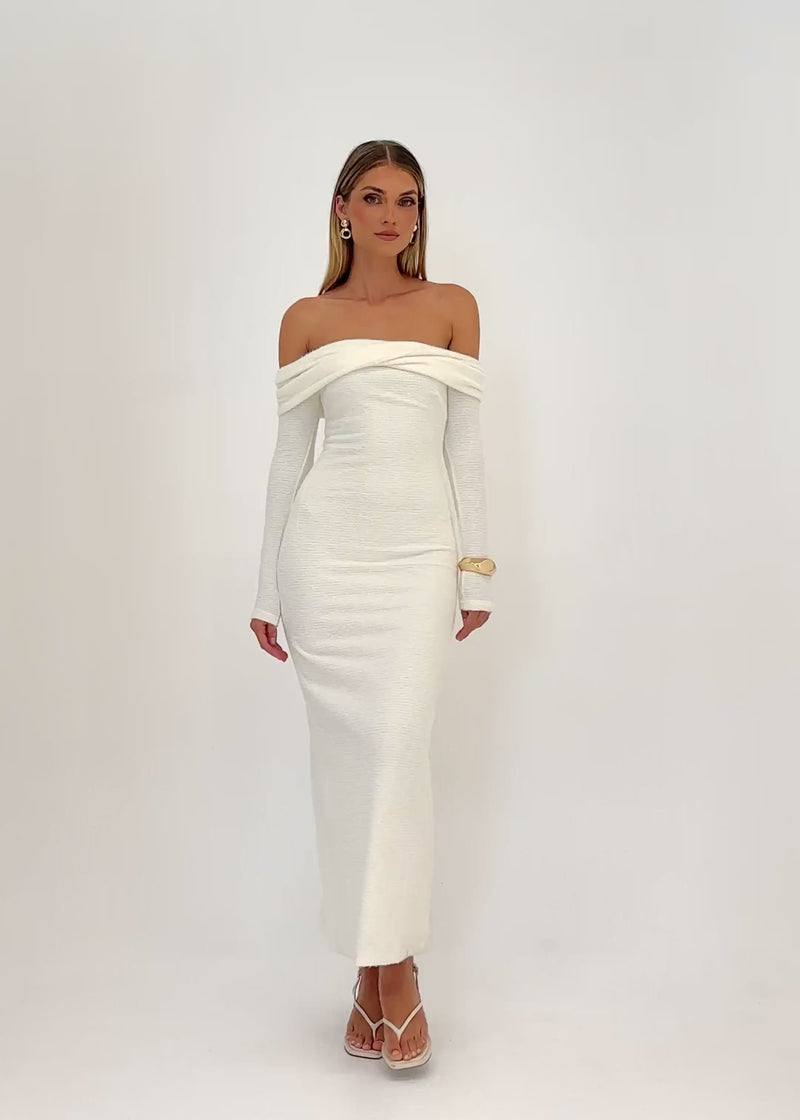 Discover an elegant statement piece for your wardrobe with the Ace Off Shoulder Maxi Dress, in a sophisticated cream shade. For a refined daytime event, pair it with comfortable wedge heels and a structured clutch. For an evening look, opt for elegant heeled mules and delicate accessories for a polished finish.