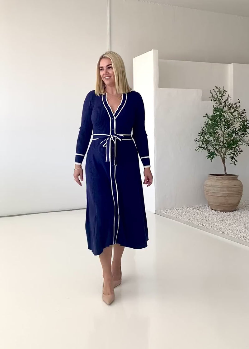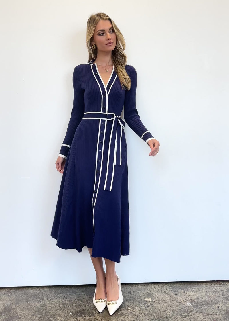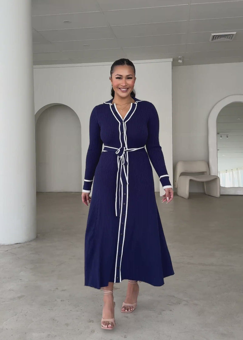 Flatter your curves in the chic Adah Knit Midi Dress in sophisticated navy—its defining tie-waist belt sculpts your silhouette. Stun in pointed heels or stilettos for evenings, or pair with knee-high boots for daytime polish. Layer under a tailored coat for office-to-event elegance.