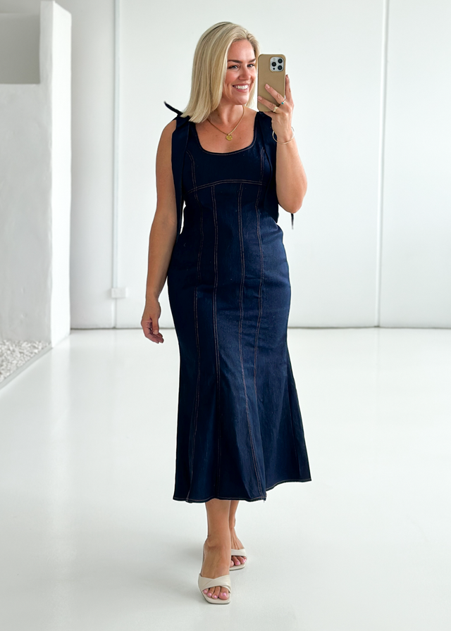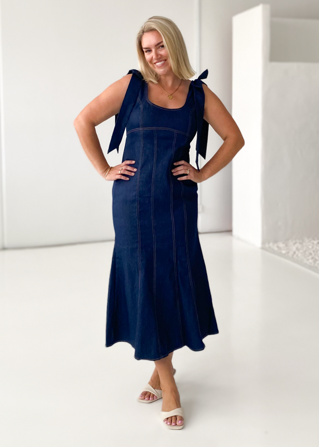 Make denim feel fresh again with the Adeline Midi Dress in Indigo. Wear it with white trainers or tan mules for day plans, and switch to heeled boots for evenings. Add a structured tote and minimal silver jewellery to complete the look.