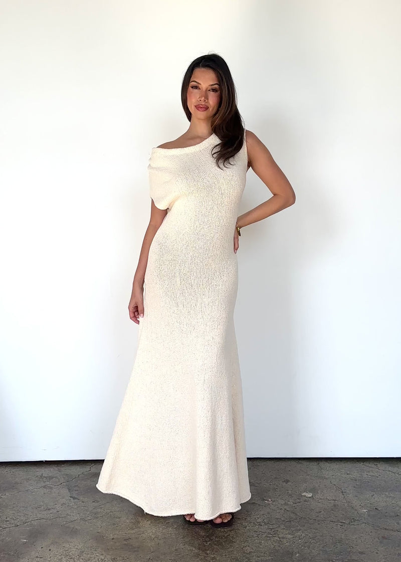 Minimal and modern, the Aje Knit Maxi in beige is your go-to for effortless sophistication. The drop shoulder detail and relaxed fit make it easy to wear with slides or boots.