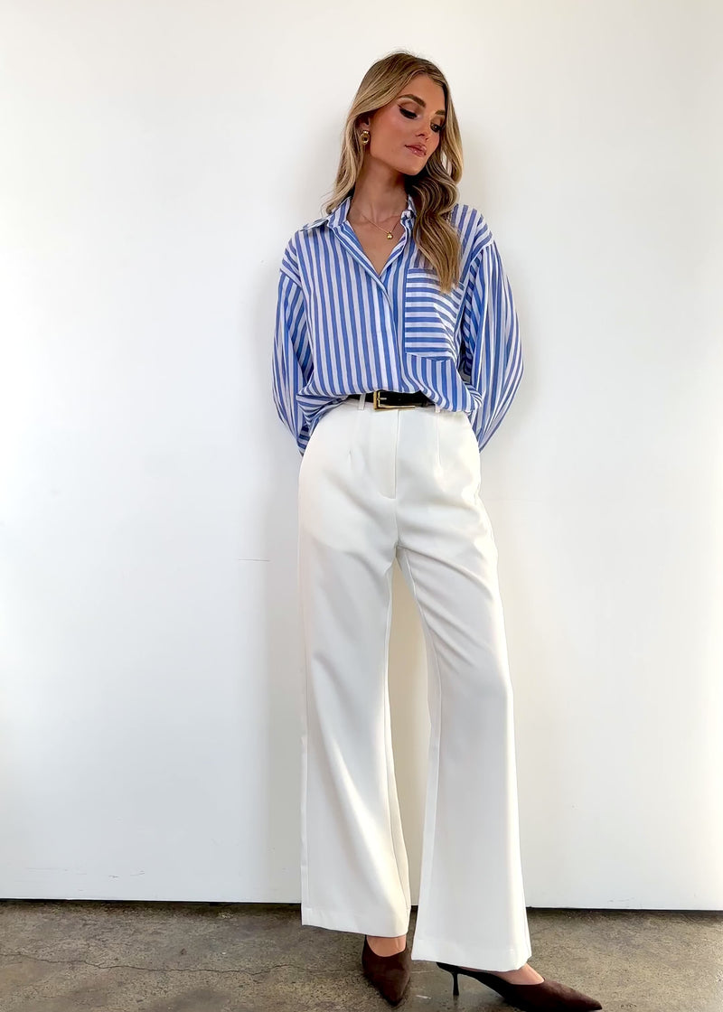 Laidback yet refined, the Alessandro Shirt in Blue Stripe is made for effortless styling. Tuck it into wide-leg jeans with chunky trainers for a fresh daytime look or wear it open over a white tank and tailored shorts for a relaxed summer vibe.