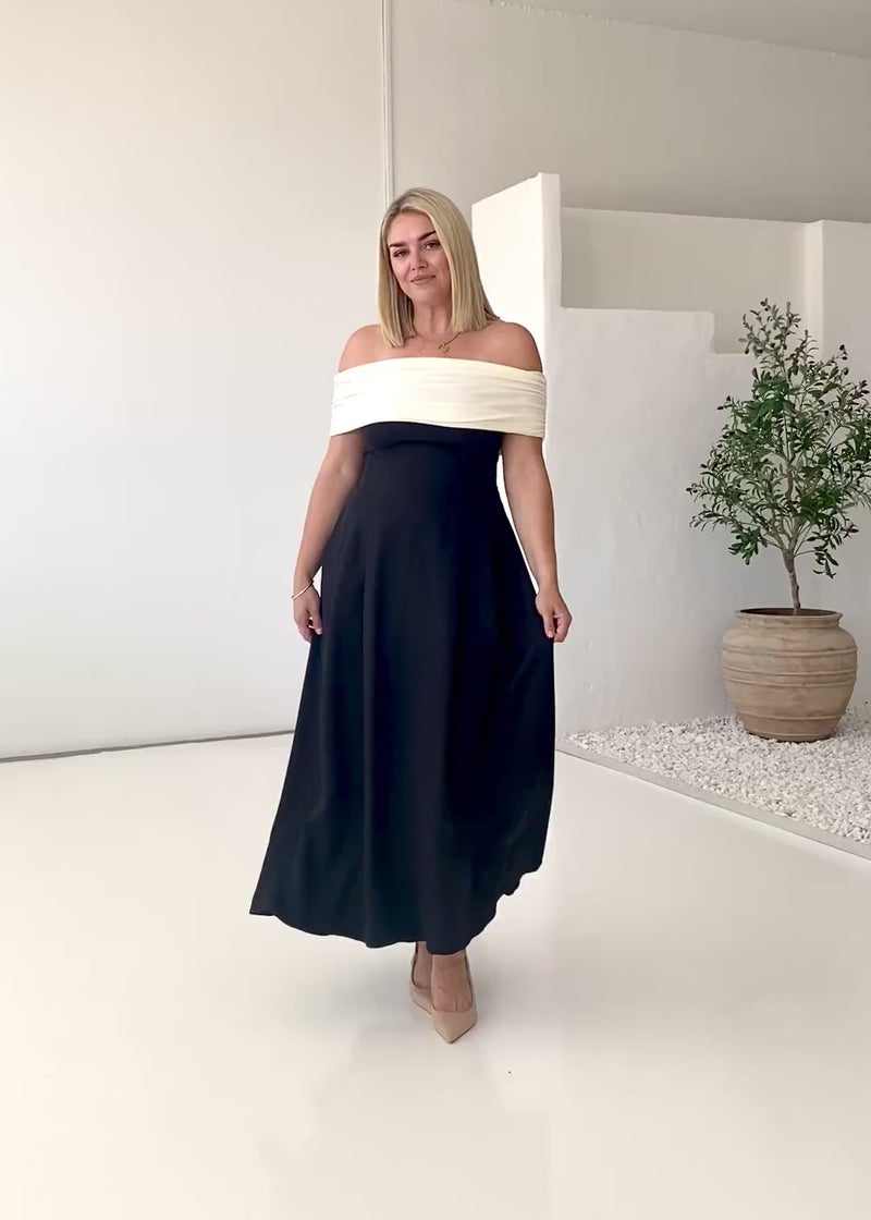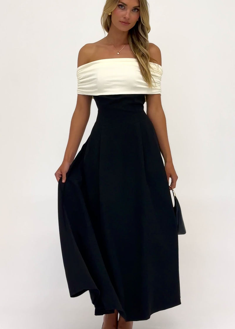 Introduce a timeless classic to your collection with the Alexiah Off Shoulder Maxi Dress, in a versatile black hue. For a sophisticated daytime event, pair it with comfortable wedge heels and a structured clutch. For an evening look, opt for elegant heeled mules and delicate accessories for a polished finish.