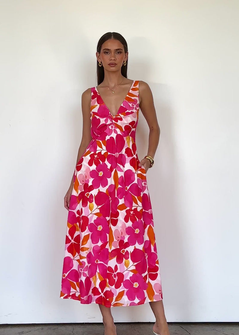 Breeze through sunny days in the Alisina Midi Dress, adorned in pink flowers and designed for feminine movement. Ideal for brunches, strolls or daytime events. Pair with understated accessories for easy chic.