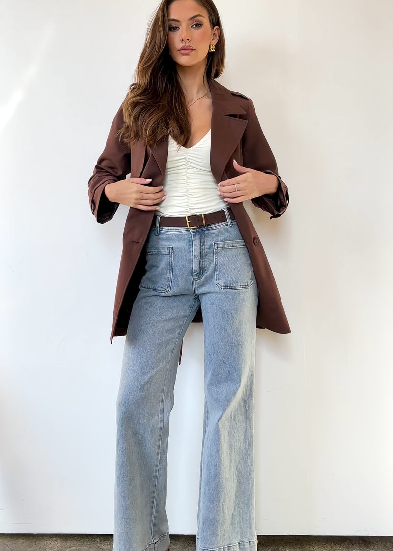 Make a statement in the Alissa Trench in espresso. The deep tone gives this cropped coat an edge, ideal for dressing up wide-leg pants or fitted dresses. Add square sunnies and a leather bag for city-girl vibes.