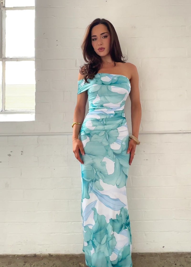 Shop the Allina Mesh Maxi Dress – Aquamarine Petal now.
