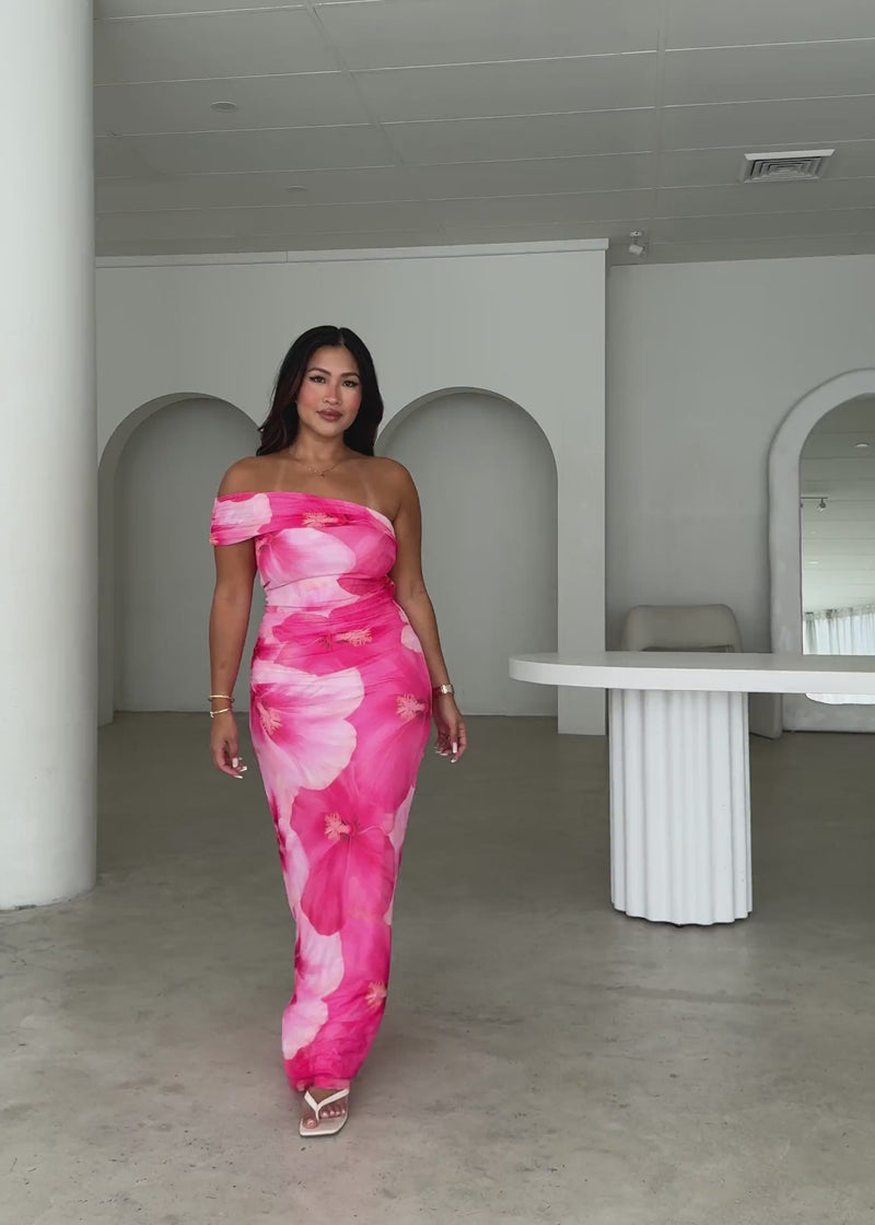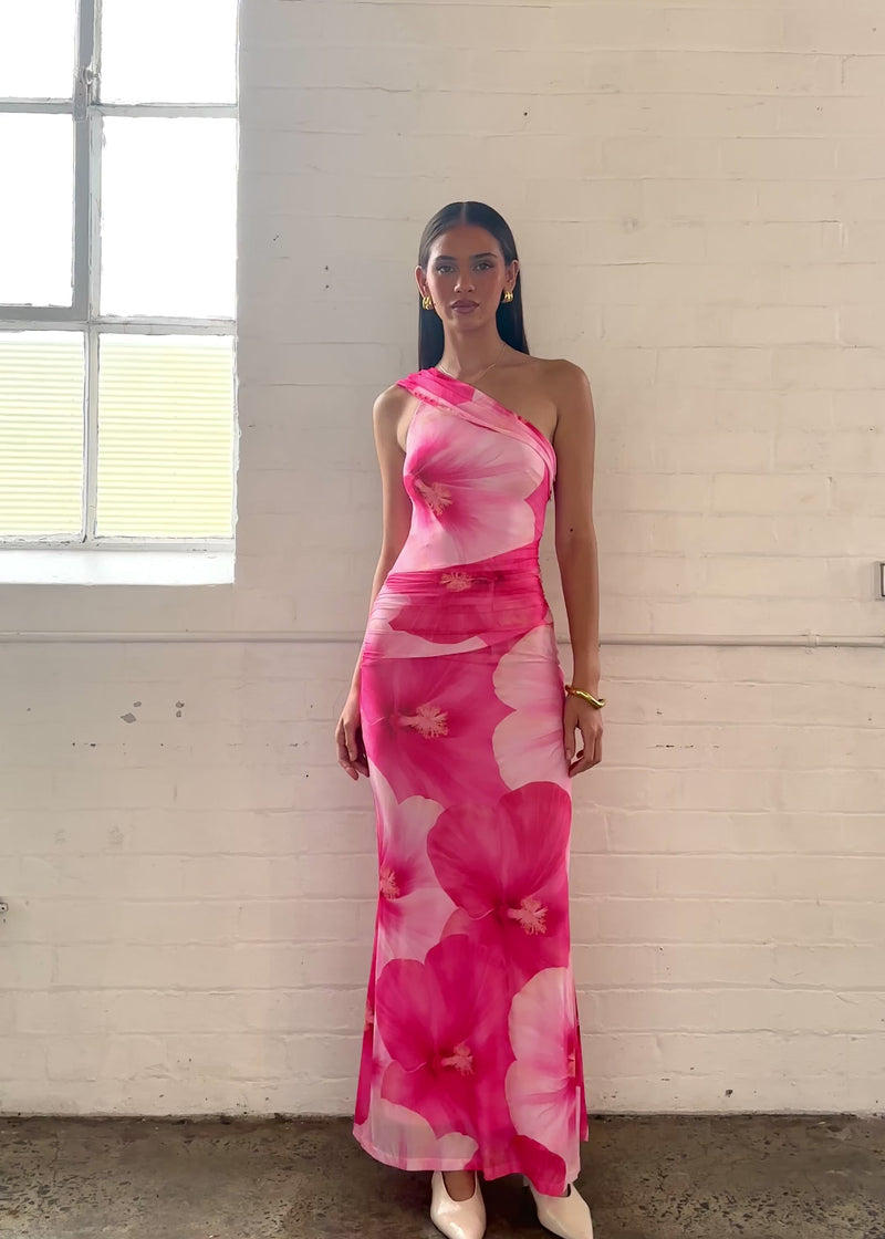 The Allina Mesh Maxi Dress is a one-shoulder beauty with bold floral detailing. Style it with metallic heels and statement earrings for events, or keep it fresh with strappy sandals.