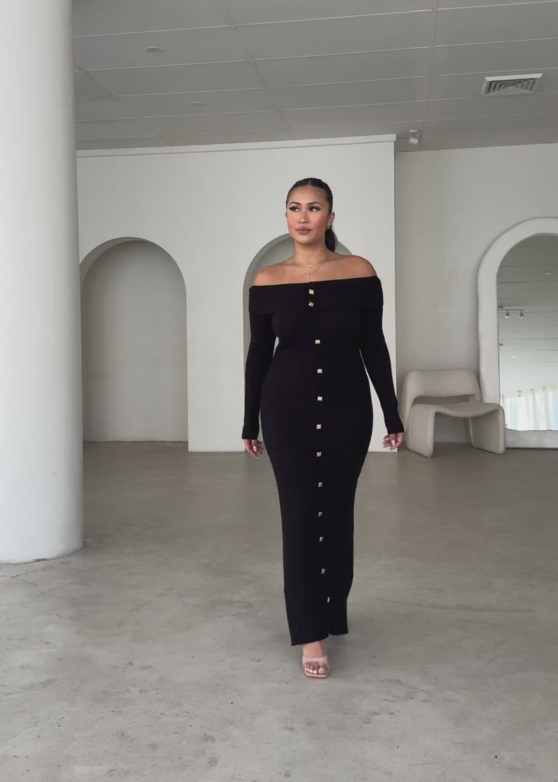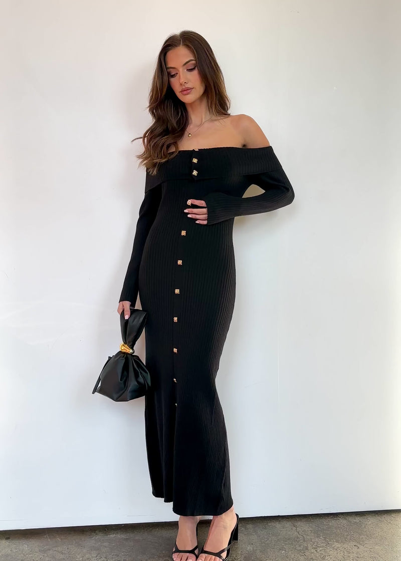 Sultry and timeless, the Aloe Dress in black features an off-shoulder neckline and flattering stretch fit. Pair with heeled mules, a bold lip, and statement earrings for your next dinner date.