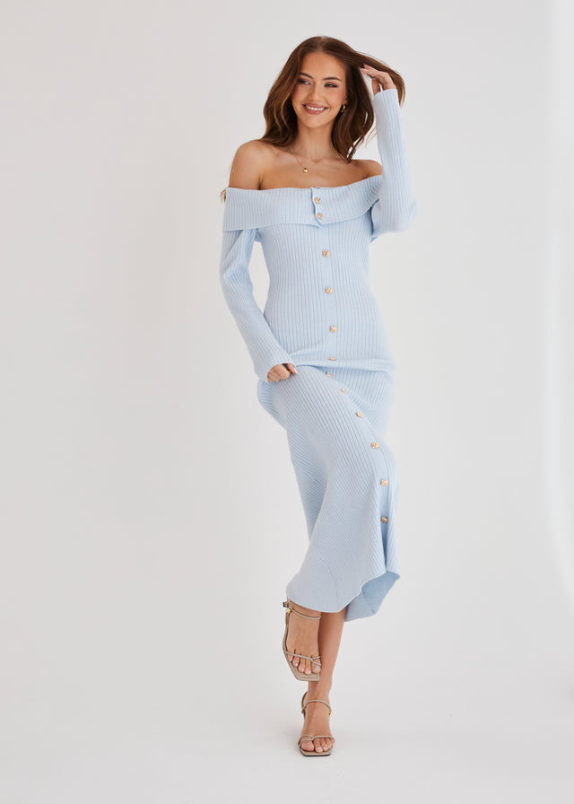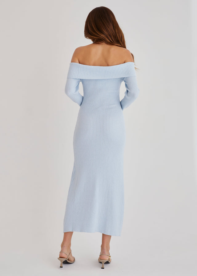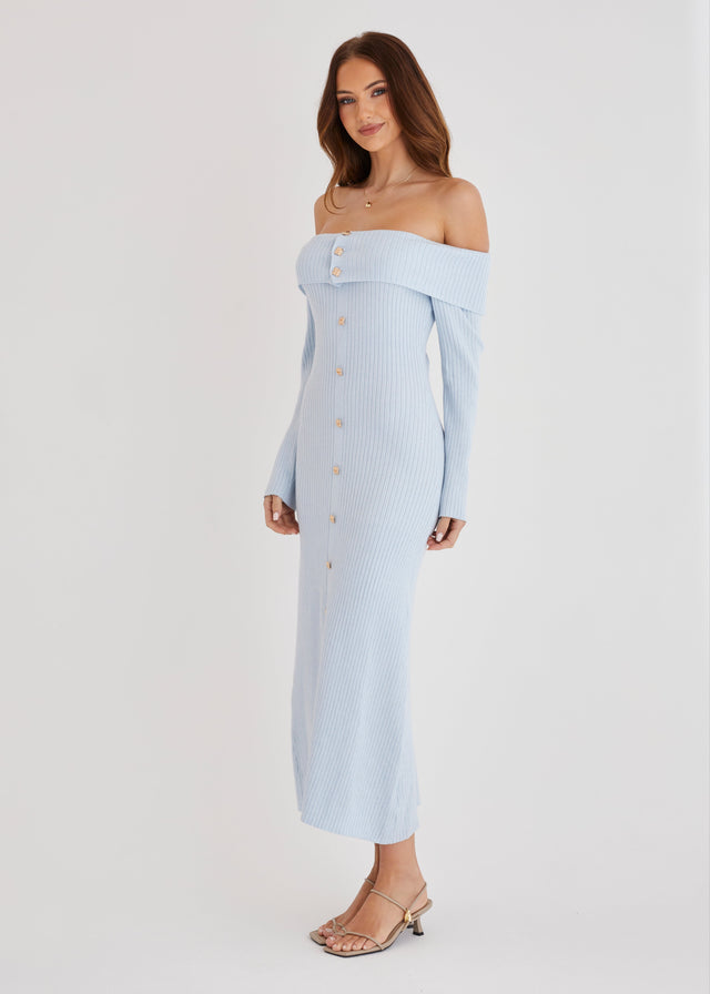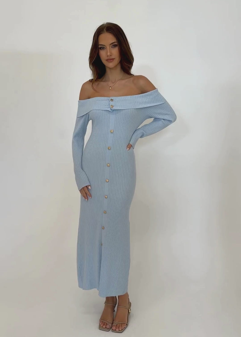 Aloe Off Shoulder Knit Maxi Dress in Powder Blue is all about soft elegance. Pair with nude heels, a pearl clutch, and dainty earrings for a refined finish.