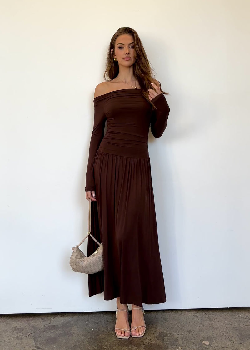 Sultry meets sleek in the Aluna Dress in chocolate. The off-shoulder neckline and flowy fit make it perfect for date nights or dressy dinners. Pair it with nude heels, a sleek low bun, and gold earrings for a clean, polished vibe.