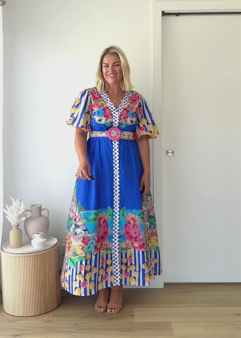 Striking and coastal-inspired, the Ambre Maxi Dress – Positano Cobalt is perfect for holidays, dinners, or summer events. Style with gold accessories and wedges.