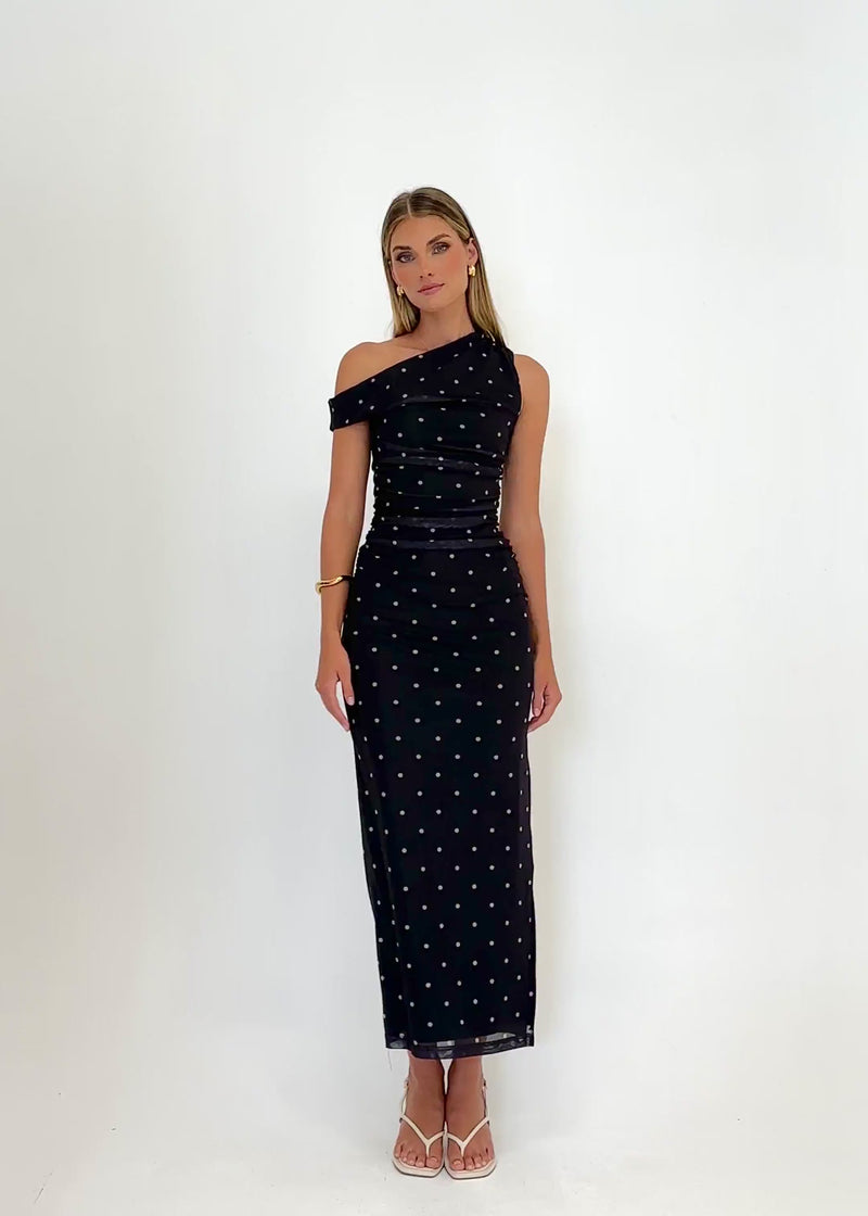 Achieve a chic look wearing Ana Drop Shoulder Mesh Midi Dress - Black Polka. A classic print and modern mesh finish add a tactile edge to a sophisticated dinner date wardrobe. Elevate this drop shoulder design with pointed black pumps and a sleek leather envelope clutch.