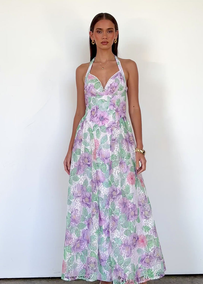 Add the Analeigh Halter Maxi Dress – Lilac Meadows to your wardrobe today.