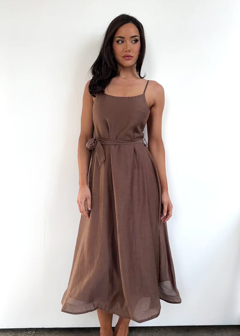 The Andrea Midi Dress - Chocolate brings soft romance to your style. Wear with neutral sandals and a crossbody for day, then swap for block heels and gold jewellery for after-dark dinners. A dress that moves with every moment.