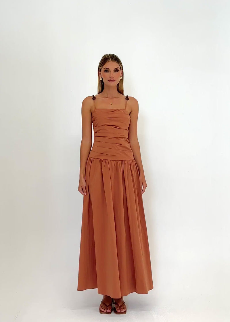 Embrace earthy elegance wearing Annetta Maxi Dress - Terracotta. A warm clay tone and flowy maxi length provide a grounded yet sophisticated look for winery tours or sunset drinks. Style this dress with tan leather sandals and a neutral fringe bag for a beautiful bohemian-inspired ensemble.