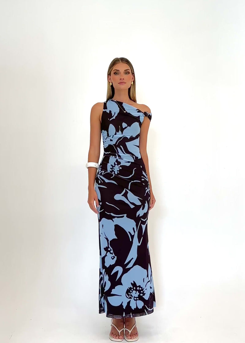 Stand out wearing Arlo Drop Shoulder Mesh Maxi Dress - Blue Espresso. A striking print and mesh texture ensure a dramatic and elegant silhouette for any resort or party rotation. Style this contemporary maxi with clear acrylic heels and a simple black wristlet bag for a sleek finish.