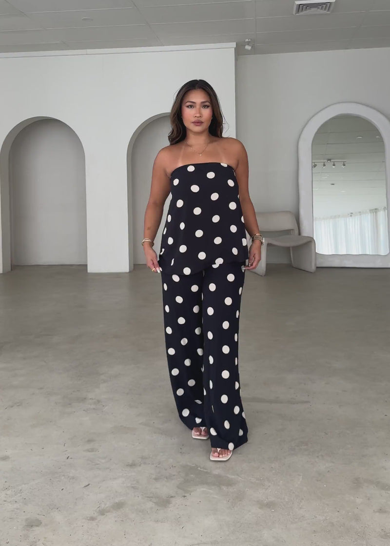 Go bold with the Artie Pants in black polka dots. Loose, comfy, and chic, these are a vibe with a simple cami or paired with the matching Artie Strapless Top. Style them with heels for a statement night-out look or flats for casual cool.