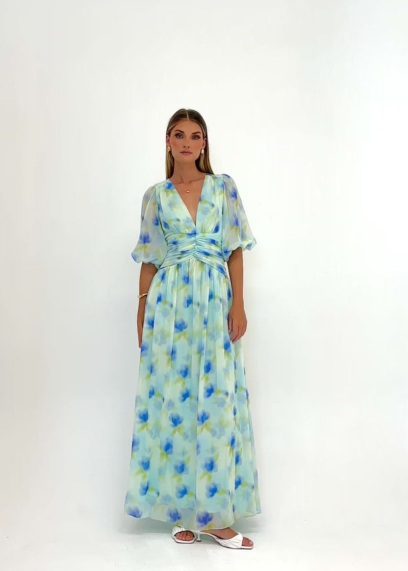 Dive into style wearing Aubree Maxi Dress - Ocean Flora for a seaside event. Deep blue tones and a serene floral pattern capture a perfect ocean vibe for tropical destinations. Pair a flowy silhouette with white lace-up sandals and a beaded shoulder bag for a polished and feminine finish.