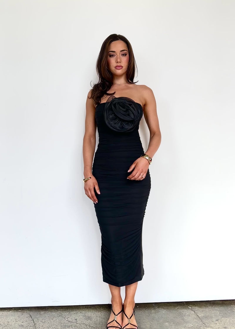 Shop the Brie Strapless Mesh Midi Dress – Black now.
