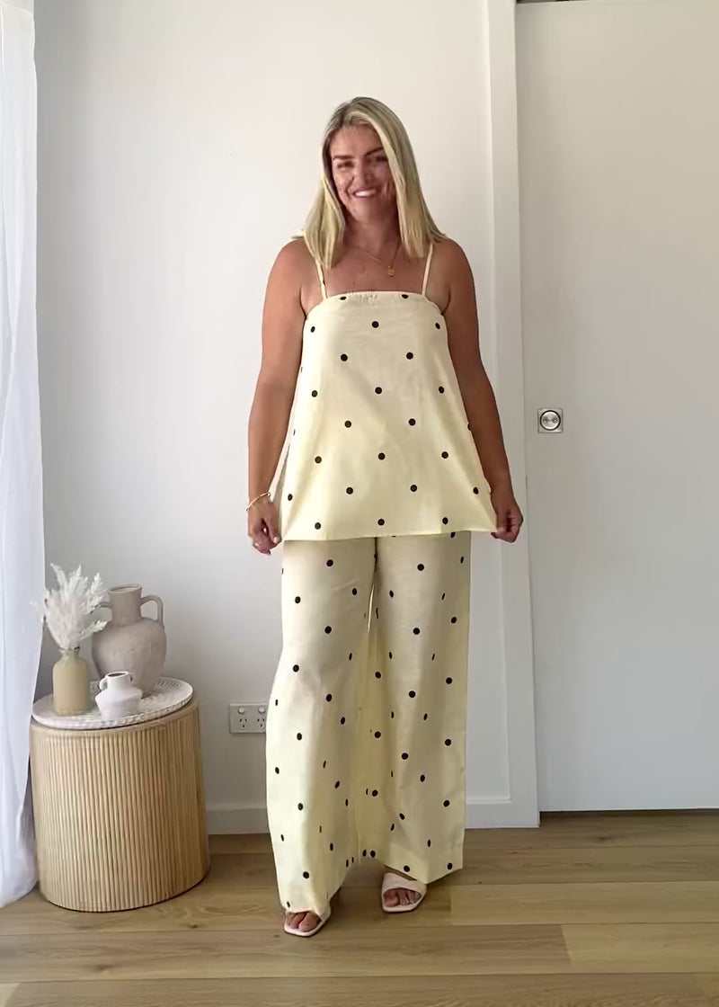 Playful and polished, the Bryant Cami in Butter Polka is perfect for sunny days. Pair it with denim shorts or the matching Bryant Pants for a coordinated look. Add slides and sunnies for extra charm.