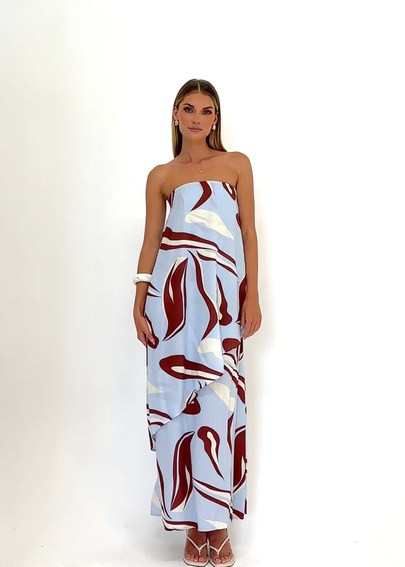 Stand out wearing Cala Strapless Maxi Dress - Blue Abstract. A striking print and strapless design ensure a dramatic and elegant silhouette for resort evenings or sunset dinner parties. Style this contemporary maxi with navy platform heels and a sleek silver clutch bag for a high-fashion look.