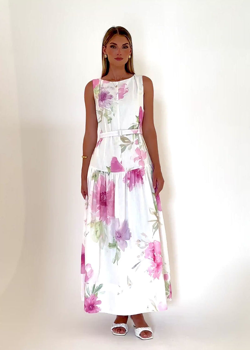 Soft romance meets event dressing in the Calypso Maxi in Pink Bouquet. Pair with wedges, a box clutch, and delicate jewels.