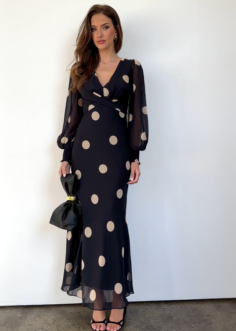 Classic meets playful in the Camellia Dress. The black base with bold polka dots and sheer sleeves gives it that flirty edge. Wear with kitten heels, red lips, and a mini shoulder bag for a retro-chic moment.