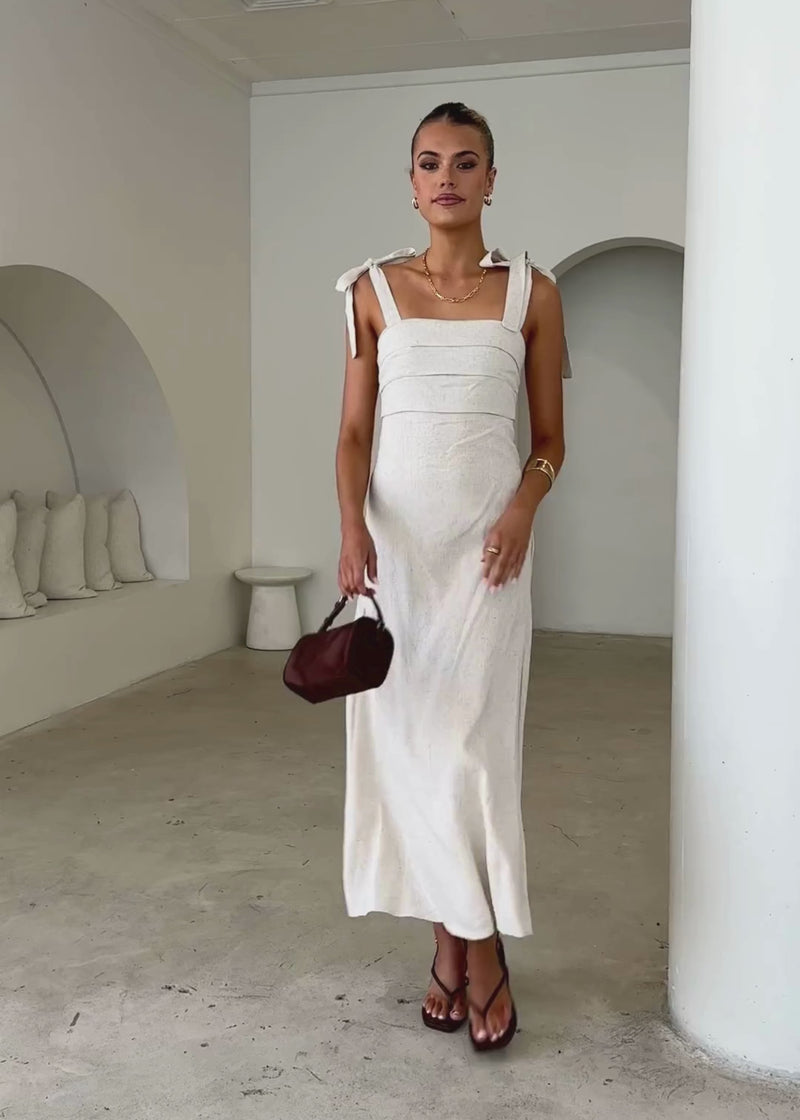 Effortlessly chic, the Cartia Maxi Dress in Oatmeal exudes elegance with its pleated front and flattering A-line waistline. Pair it with nude heels or simple ballet flats for a polished look. Style your hair in a sleek low bun and add a delicate gold necklace for a sophisticated touch. Keep accessories minimal to highlight the dress's clean, classy design.