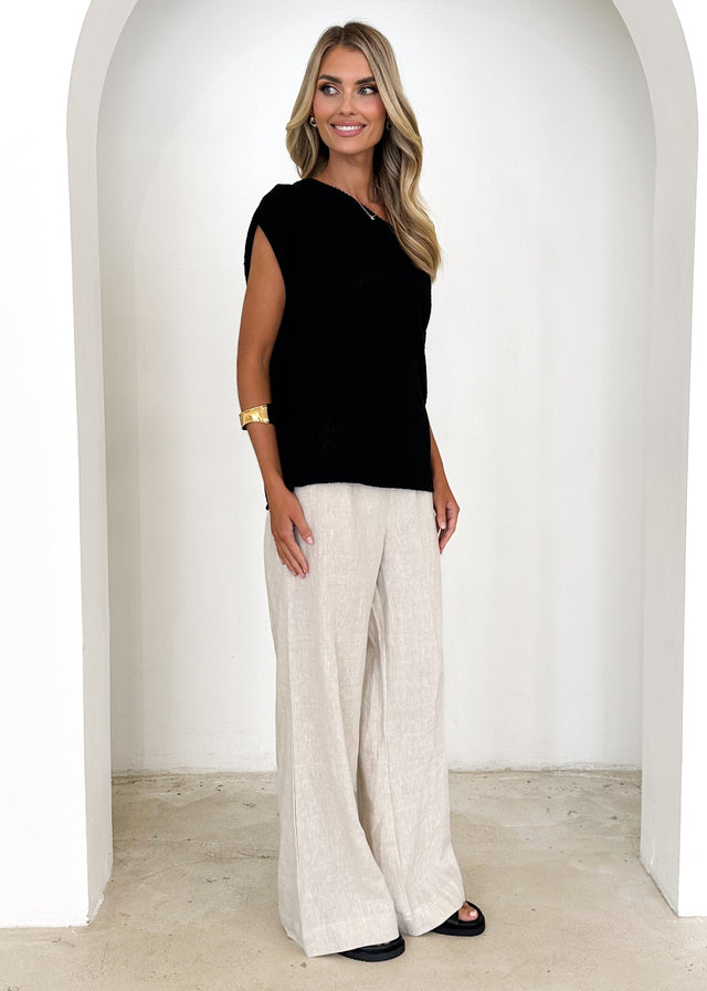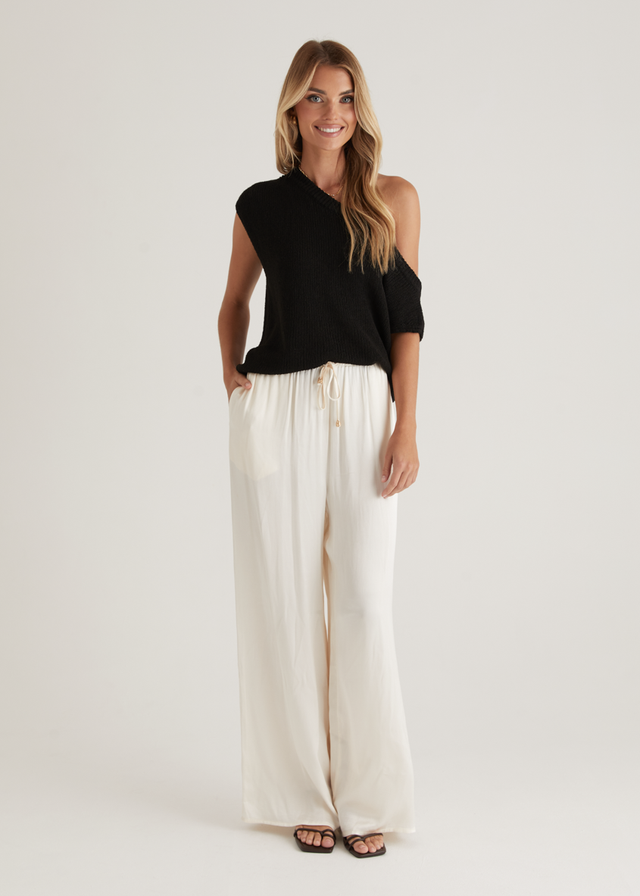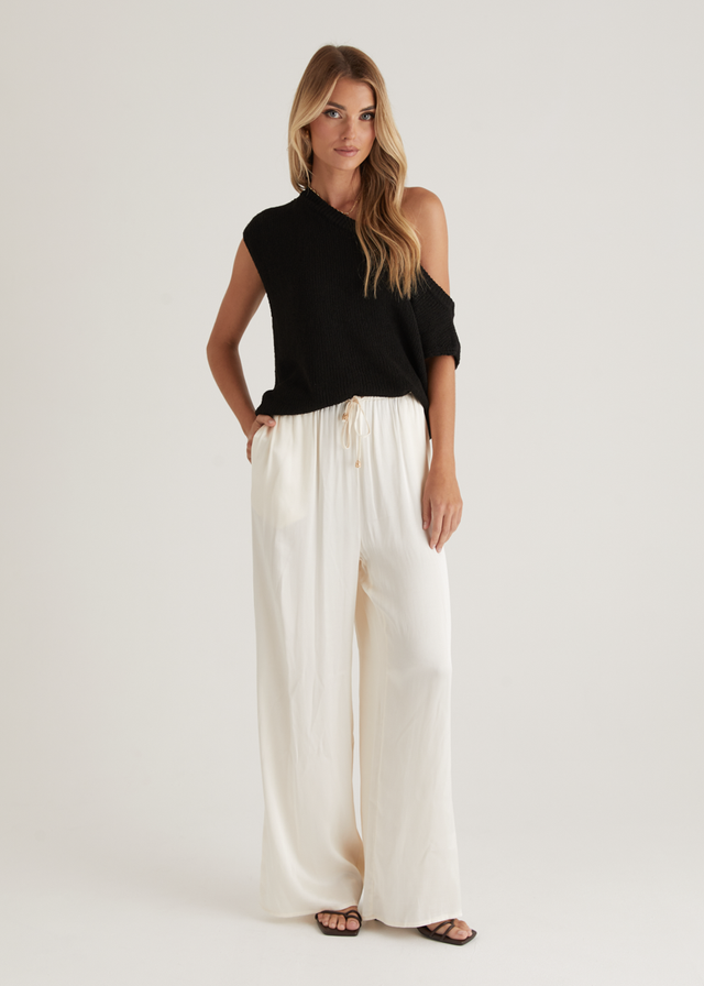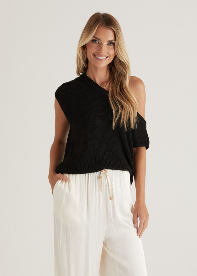 Bring a bit of edge to your wardrobe with the Casoni One Shoulder Knit Top in Black. This sleek silhouette works beautifully with wide-leg trousers or a fitted midi skirt. Style it with chunky earrings and strappy heels for your next night out.