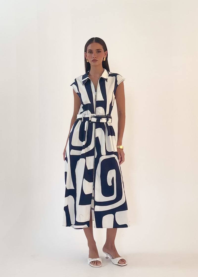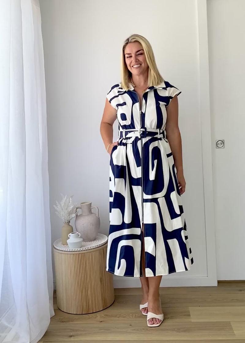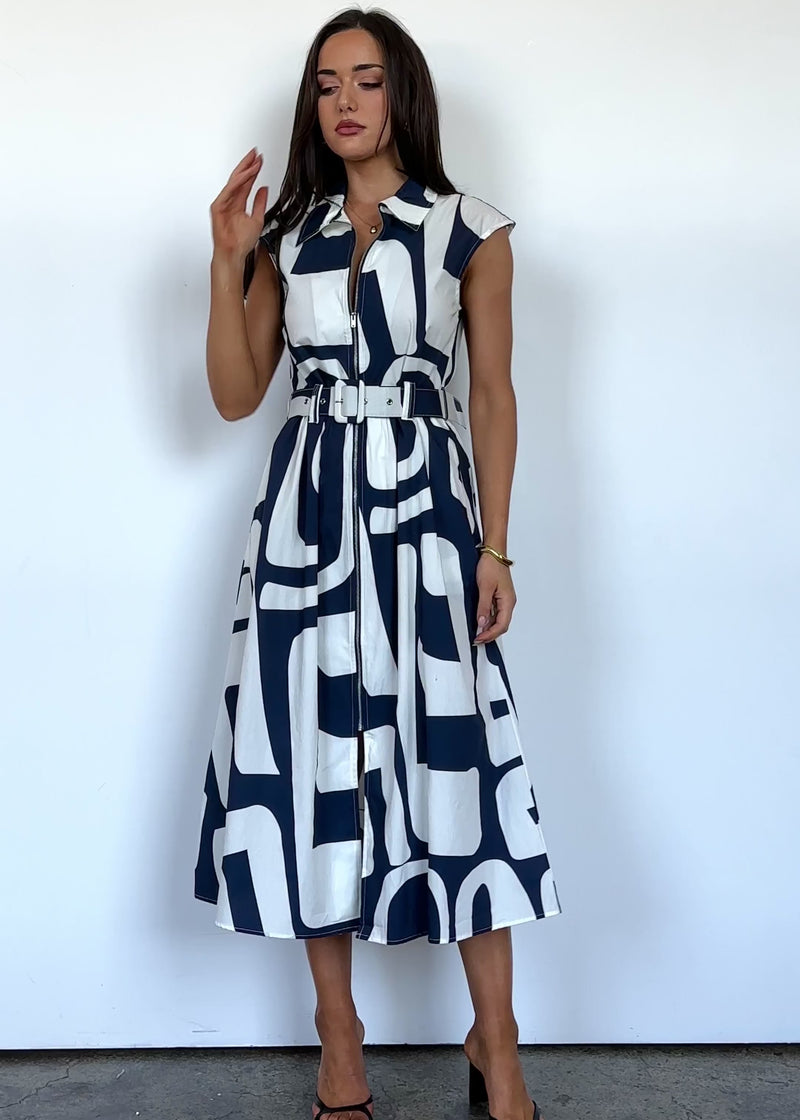 Smart-casual feels effortless with the Casper Midi Dress in navy abstract. Go daytime cool with trainers and a denim jacket, or keep it chic with strappy heels and a bold lip for evening plans.