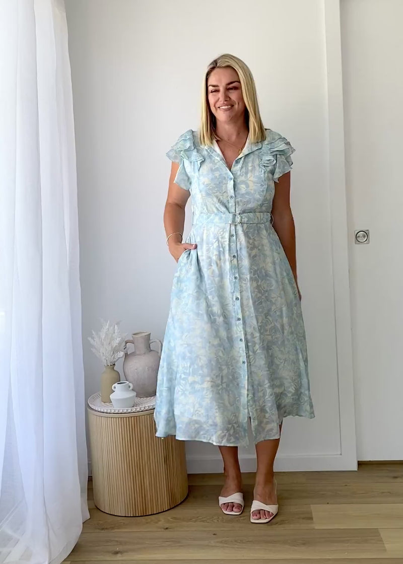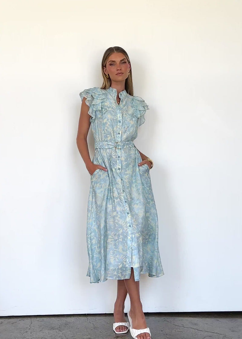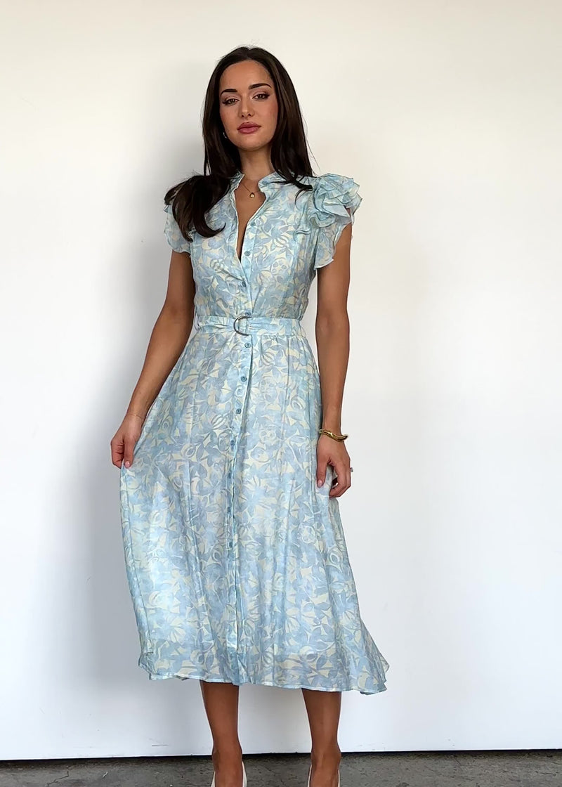 Fresh and feminine, the Cassia Midi Dress in sky blue floral is perfect for garden brunches or spring picnics. Pair with white sandals, a woven bag, and soft curls for a sweet, breezy look.