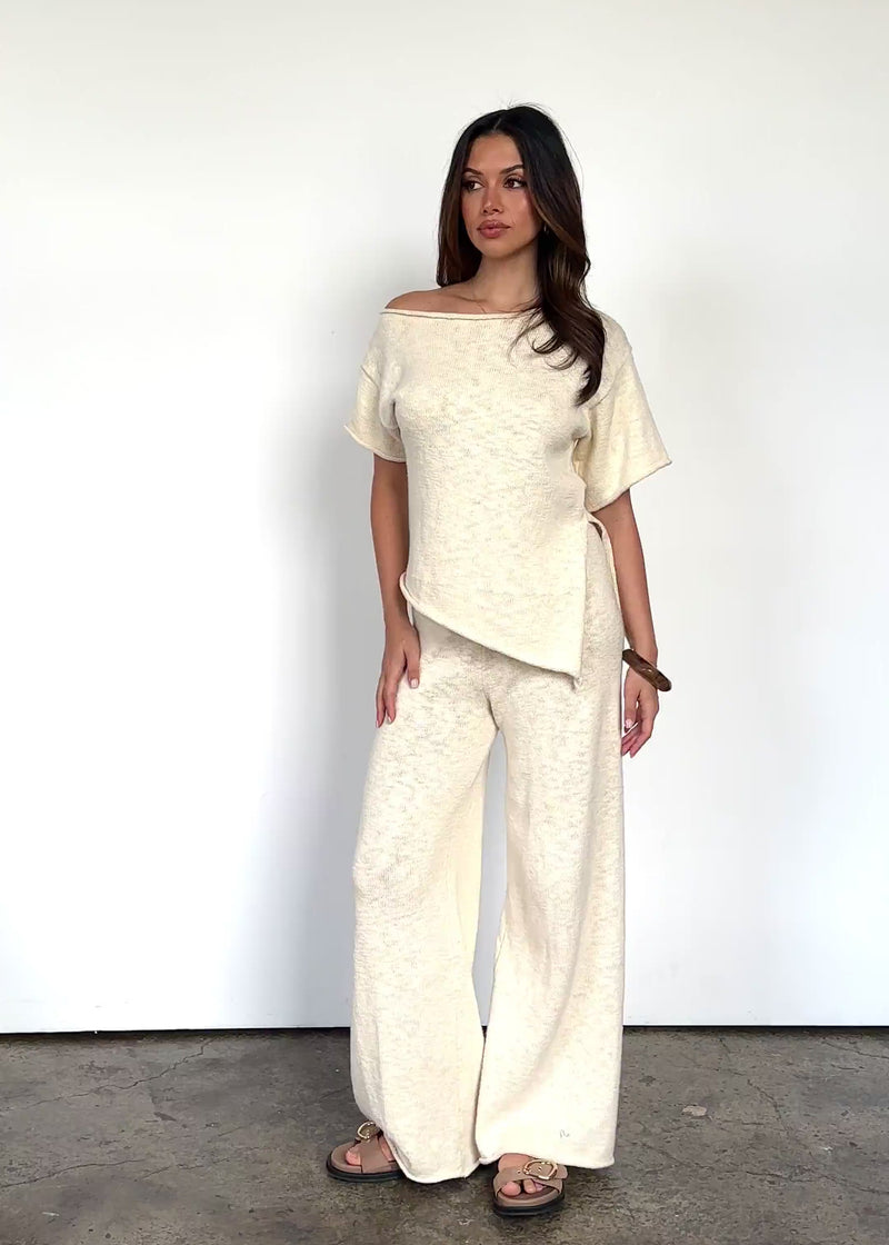 Laid-back and luxe, the Chester Knit Top in beige is your weekend essential. Its relaxed fit and drop-shoulder style make it perfect with denim or the matching knit pants.