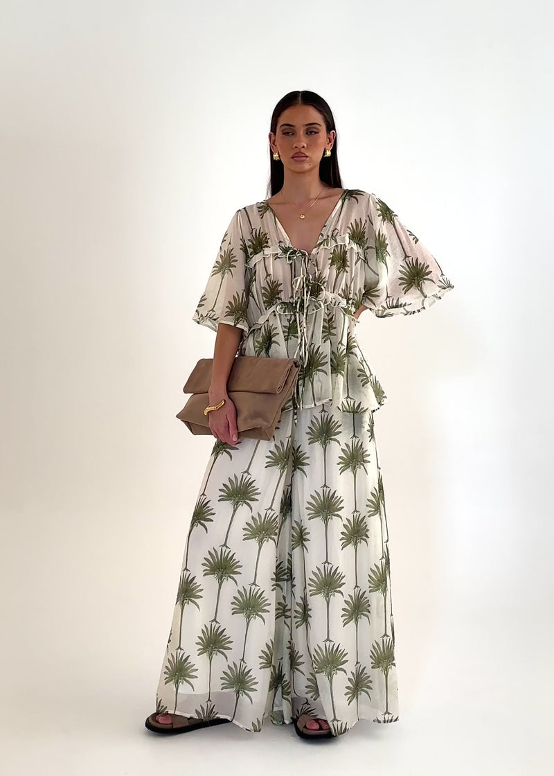 Relaxed yet refined, the Codey Wide Leg Pants in sage palms are the perfect holiday staple. Pair with the Imelda Blouse for a breezy co-ord or contrast with a crisp white shirt for city chic.