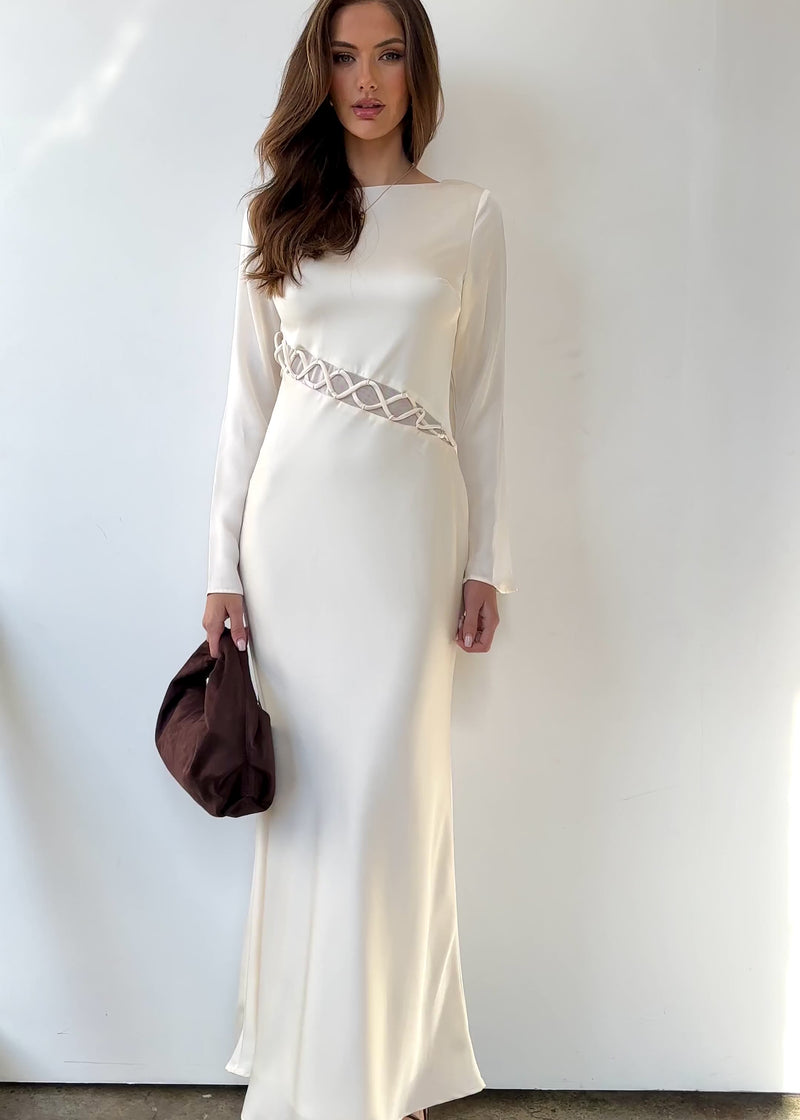 The Roby Maxi Dress in Cream brings a soft, feminine vibe to any occasion. Style it with nude heels and a woven clutch for an elegant day event, or switch to gold hoops and strappy sandals for a relaxed evening look.