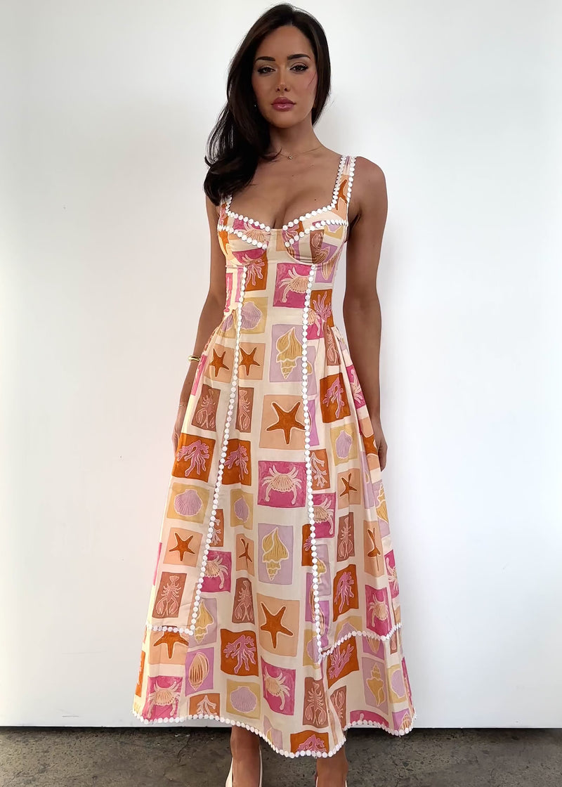 Fresh and bold, the Cyanne Midi Dress - Coral Tile is made for sunny days. Style with sandals and a woven tote for casual chic, or elevate with gold hoops and heels for evening plans. Its vibrant print makes every outfit stand out.