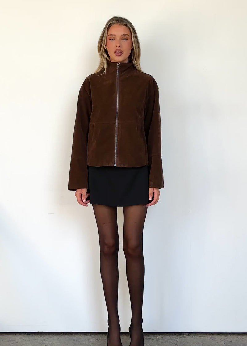 Rich chocolate suede adds texture and depth to any outfit. Layer over tops, dresses, or knits for a refined finish. Dallas Suede Jacket brings warmth and style together effortlessly.