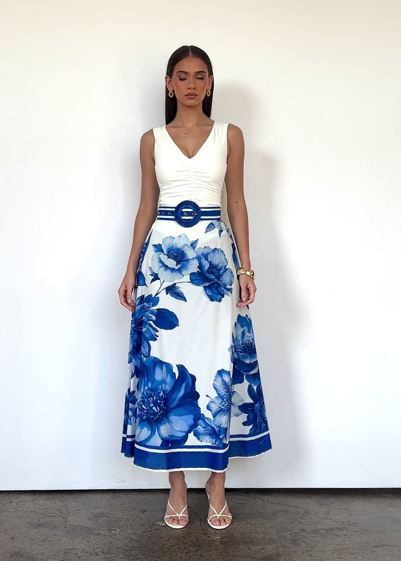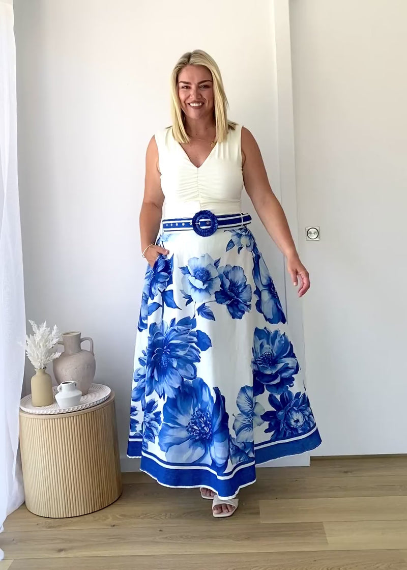 Soft, flowy, and perfect for summer, the Dejana Maxi Skirt – Cobalt Dahlia makes everyday styling easy. Pair this floral women’s maxi skirt with a white cami and flats for that effortless chic vibe.