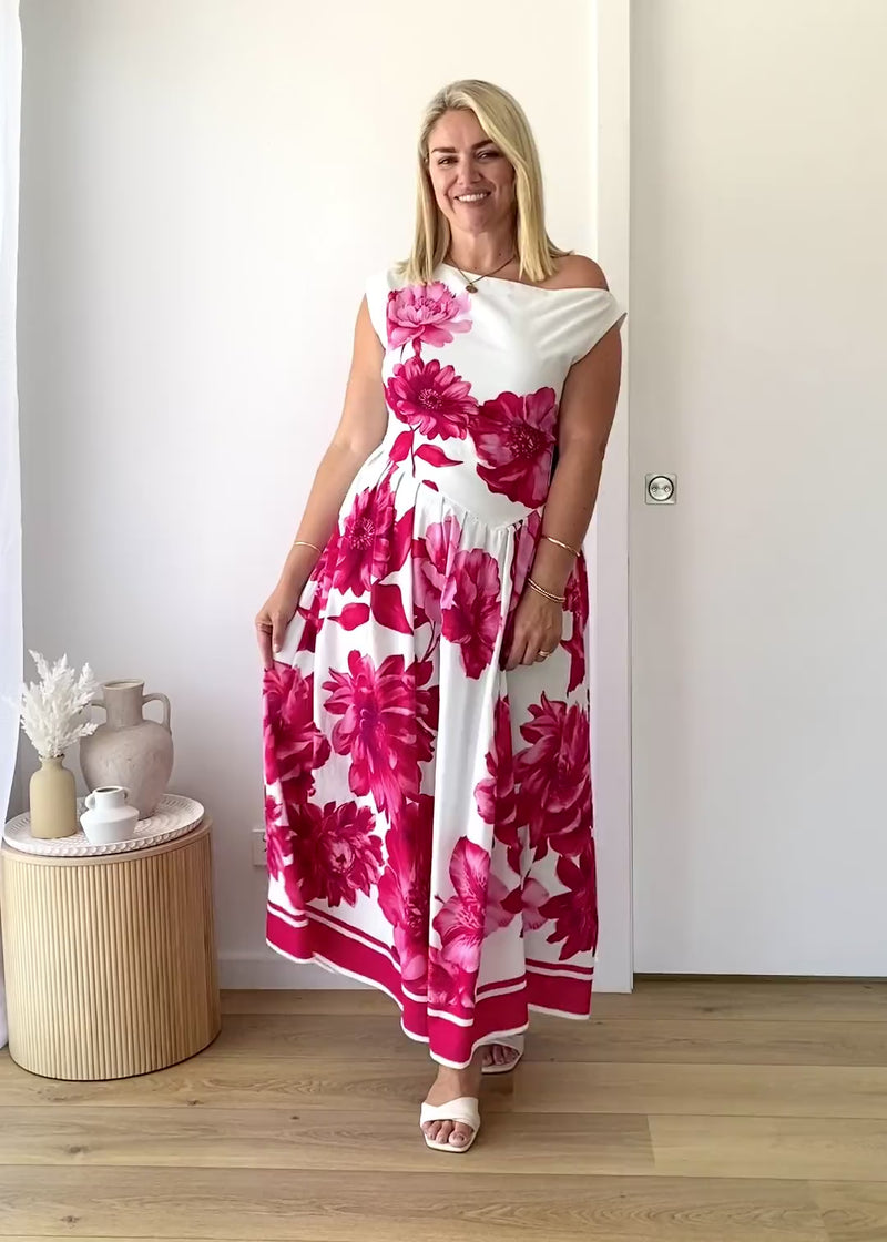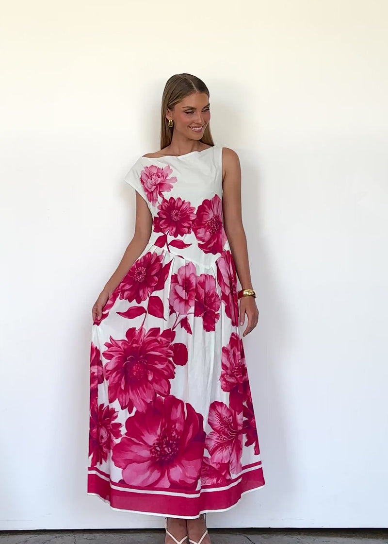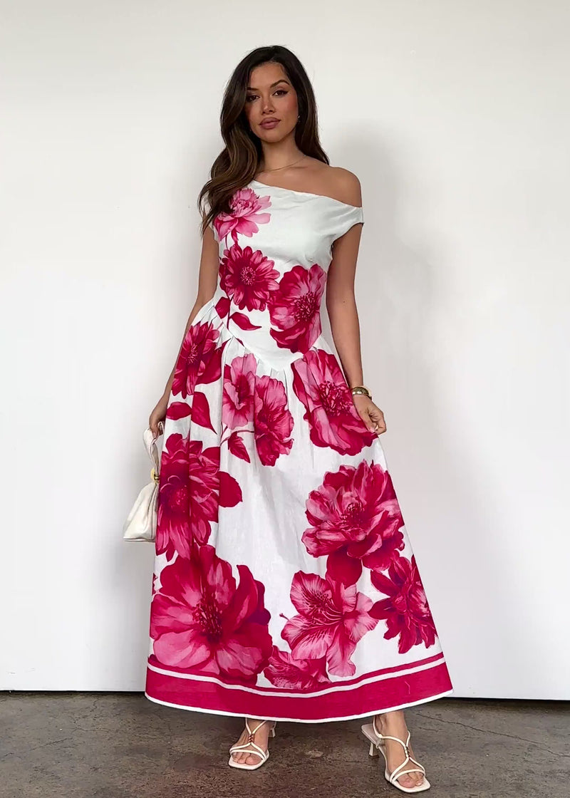Make a statement in the Deon Drop Shoulder Maxi Dress in ruby dahlia. Its bold floral print and relaxed silhouette suit garden parties or sunset dinners. Pair with gold hoops and strappy heels for elevated charm.