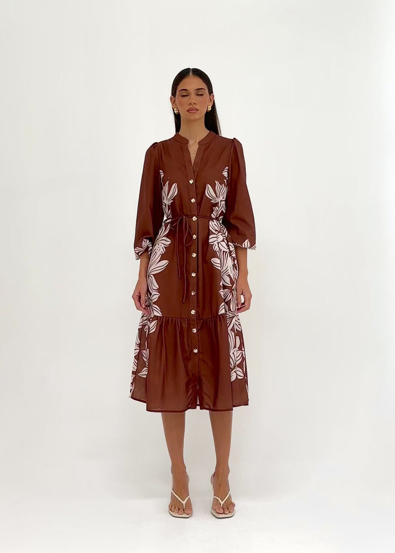 Soft florals meet rich tones in the Dijana Midi Dress – Cacao Floral. This cacao floral midi dress is perfect for brunch, garden parties or weekend celebrations. Style with strappy heels and gold jewellery for events, or pair with sandals and a woven bag for daytime polish. Feminine, flattering and easy to wear.