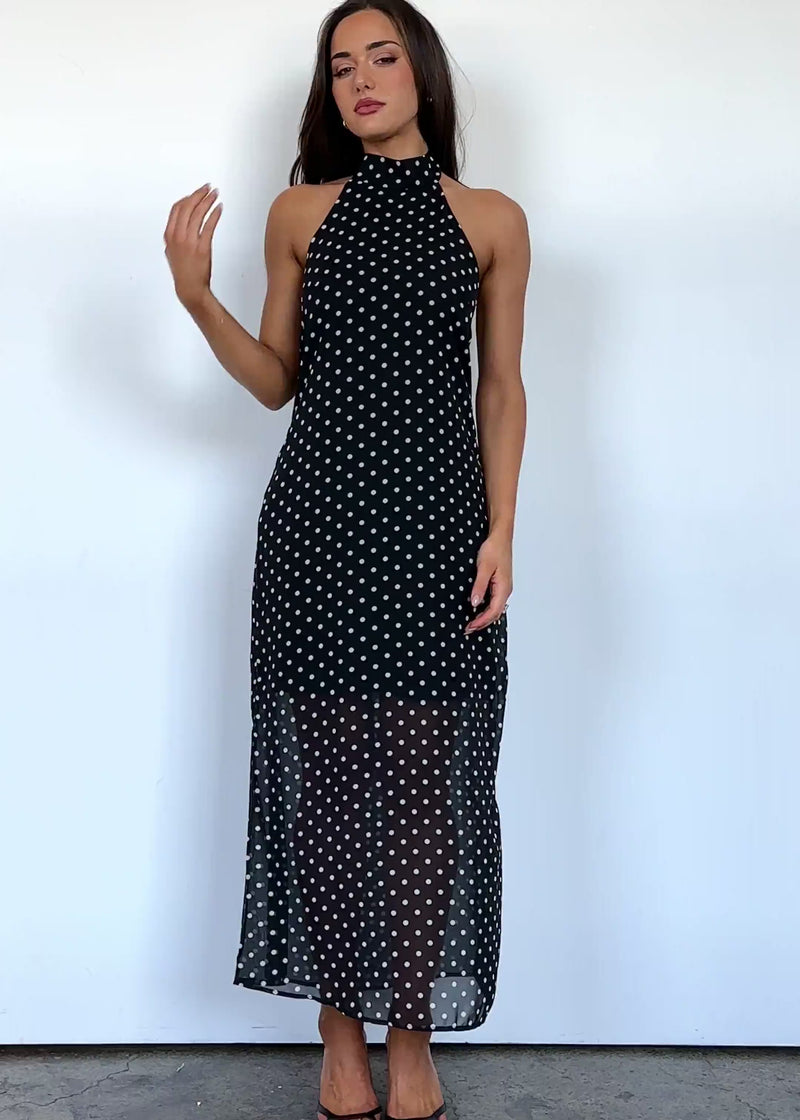 Sleek and striking, the Disillusion Halter Maxi Dress in Black is your perfect after-dark piece. Pair with heels, a statement clutch and bold red lips for evening glamour, or layer with a blazer for elevated style.