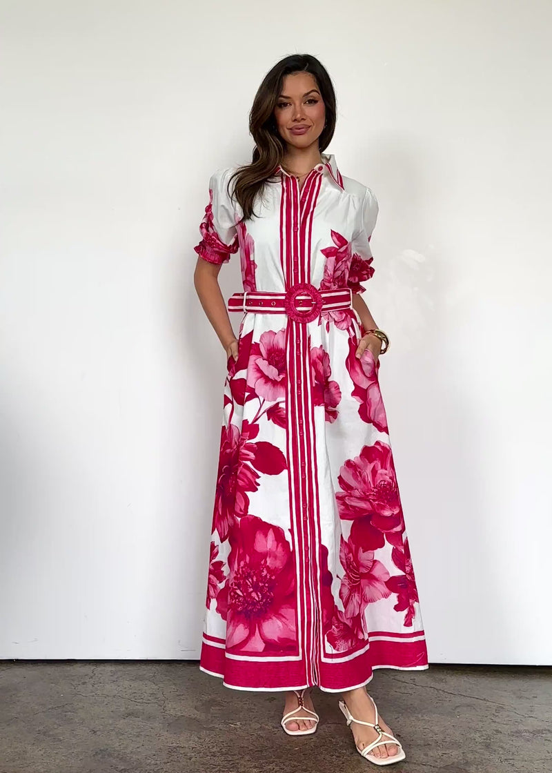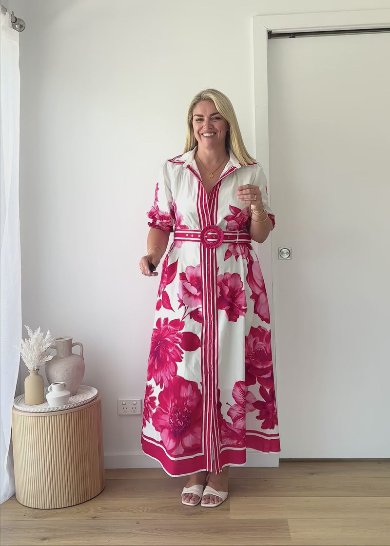 Floral done fierce: the Dylan Maxi Dress in ruby dahlia blends rich tones with a flowing fit. Pair with block heels and statement earrings for evening glam, or sandals and a sunhat for brunch.